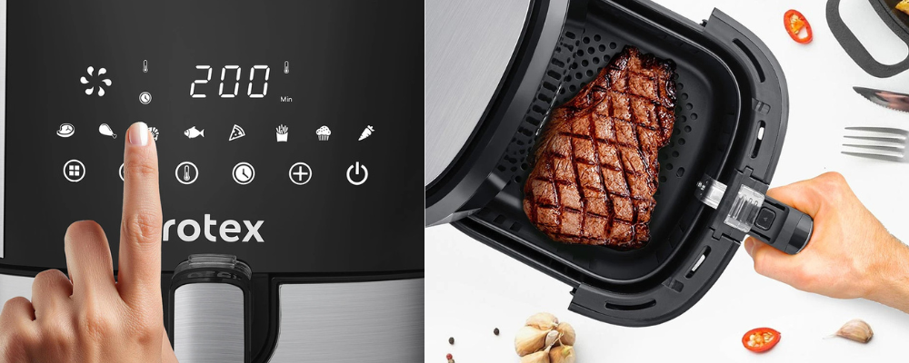Втомилися від жирної їжі, але обожнюєте хрустку скоринку? Тоді познайомтеся з мультипіччю Rotex. Це потужний кулінарний девайс на вашій кухні. З великою чашею на 7.5 літра і кошиком на 6.5 літра, ви легко приготуєте повноцінну смачну вечерю для всієї родини і заощадите час. Унікальна система верхнього та нижнього нагріву гарантує ідеальне пропікання без необхідності перевертати страву. Інтуїтивне сенсорне управління дозволяє з легкістю вибрати одну з 8 автоматичних програм, таких як Картопля фрі, Стейк або Курка. Готуйте улюблені хрусткі страви з мінімумом олії або зовсім без неї, роблячи ваше харчування значно кориснішим. Просто оберіть програму для Піци, Мафінів чи Риби, а Rotex зробить усе інше.