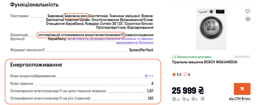 Зазвичай цю інформацію можна знайти на етикетці чи у характеристках техніки – тут зазначають очікувану кількість кіловат-годин, яку прилад споживає за рік. На сайті Фокстрот ця інформація про Енергоспоживання можна знайти в Характеристиках товару: