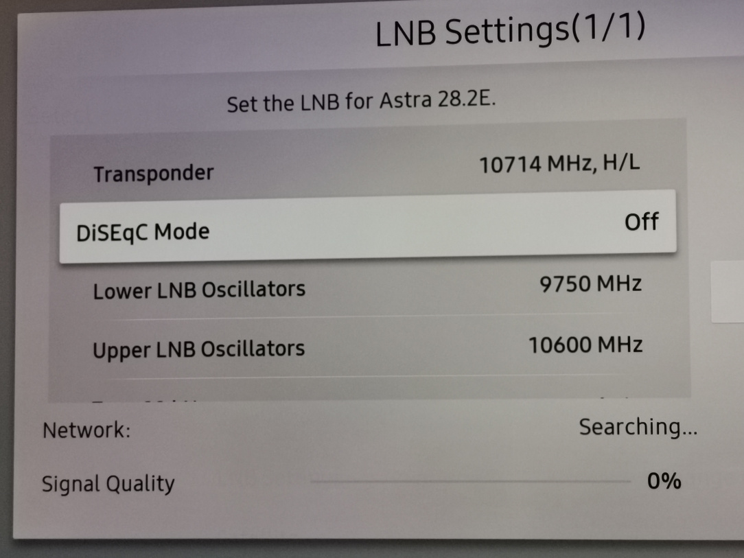 После ввода данных начинается самый кропотливый процесс. Антенну нужно очень медленно поворачивать по горизонтали, а затем, если сигнал не найден, немного изменить угол наклона и повторить поворот. Как только на экране появятся шкалы «уровень» и «качество» сигнала, нужно микродвижениями добиться максимальных показателей качества.