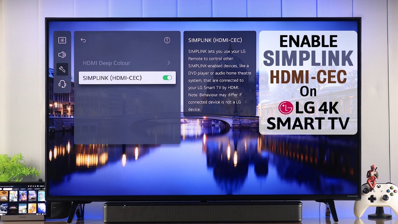 На телевізорах LG дротове підключення через HDMI ARC налаштовується в меню «Налаштування» → «Звук» → «Аудіовихід». Там потрібно вибрати пункт «Аудіовихід (оптика/HDMI ARC)». Для зручності керування всіма пристроями з одного пульта слід активувати опцію SIMPLINK у параметрах.